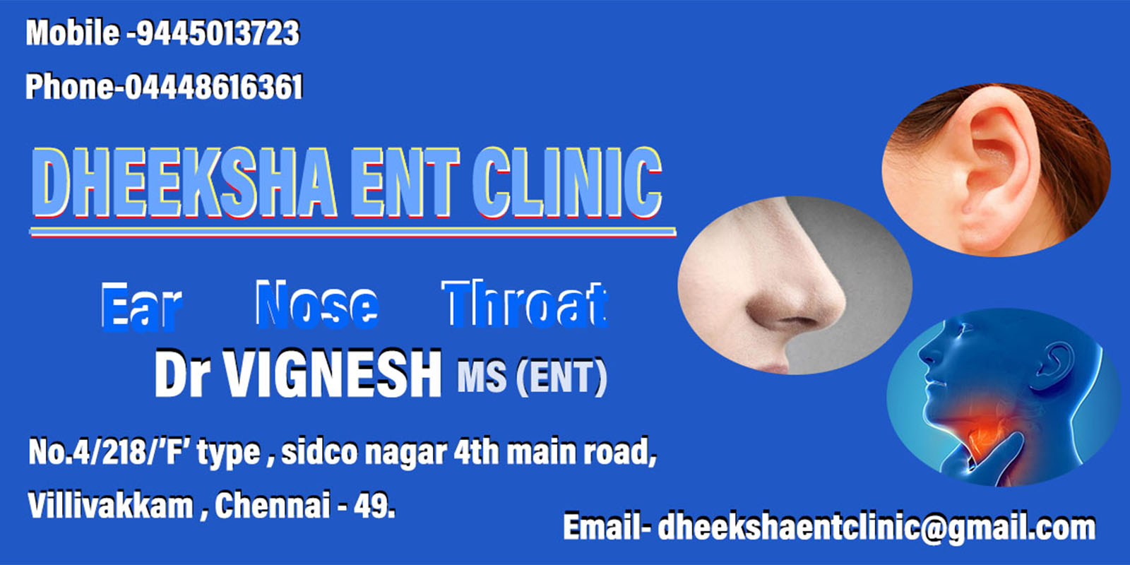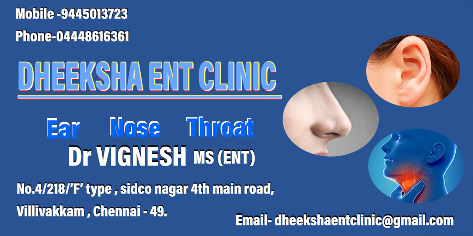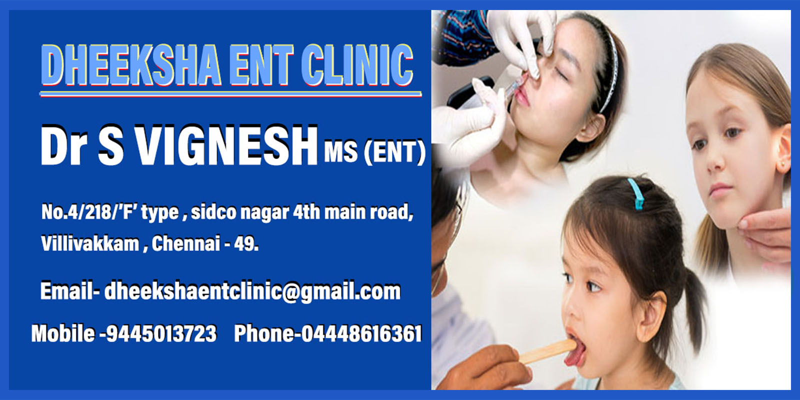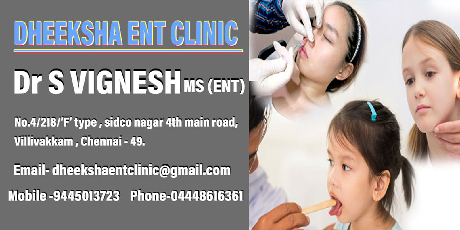 DHEEKSHA ENT CLINIC specializes in the medical and surgical treatment of pediatric and adult ear, nose, and throat disorders, including allergies, sleep apnea and snoring, hearing and balance disorders, voice disorders, endoscopic sinus surgery, and head and neck surgery.